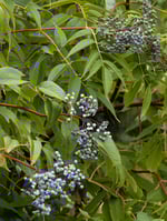 Blue Elderberry is a very valuable native food bush/ small tree. It's also an incredibly beautiful bush with a lot of wildlife value! It has three seasons of garden interest with the beautiful lush leaves that sprout in the Spring, large white umbel flowers appear through Summer, followed by those beautiful blue berries it's most known for! Both the flowers and berries are edible once cooked, are highly nutritious, and can be make into delicious syrups, wines, pies, and jellies. Blue Elderberry, like the Red Elderberry, is beloved by wildlife of all kinds. Song birds value it for the abundance of insects drawn to it Spring through early Summer, followed by the delicious berries beginning in late Summer until they're all gone. Blue and Red Elderberry bushes are very complementary in the garden setting. Red Elderberry blooms easily a month earlier than the Blue, extending their beautiful flower show.