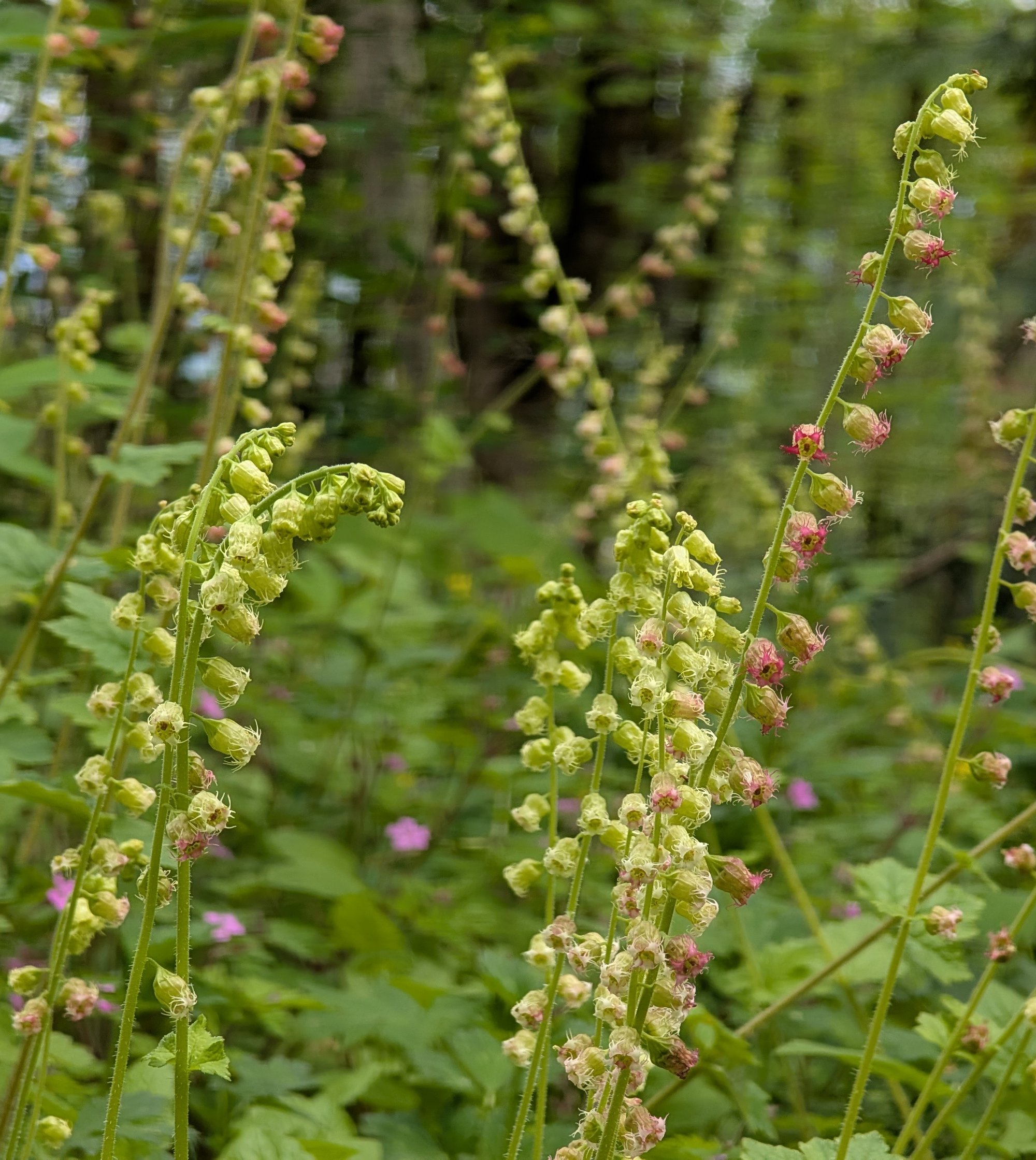 Fringecup is a fantastic ground cover for the shady garden. Once established, they are very adaptable and tough. When planted en masse they are gorgeous! The first photo shows a Fringecup grove in Forest Park in Portland, Oregon - look close enough and you can see how effectively it is suppressing weeds like Herb Roberts! Fringecup spreads via rhizomes and are excellent self-seeders. When happy they can multiply quickly! They blend very well with other native shade ground covers such as Pacific Waterleaf, Oregon Oxalis, False Lily of the Valley, Western Columbine, etc. They require a fair amount of moisture when first planted, but once established they are quite drought tolerant! Fringecup grows happily in shade - part shade, and in a variety of soil types including clay, loam, and rich forest or garden soil. In mild climates they are semi Winter deciduous-evergreen. Their flowers attract native bees. flies, and hummingbirds!