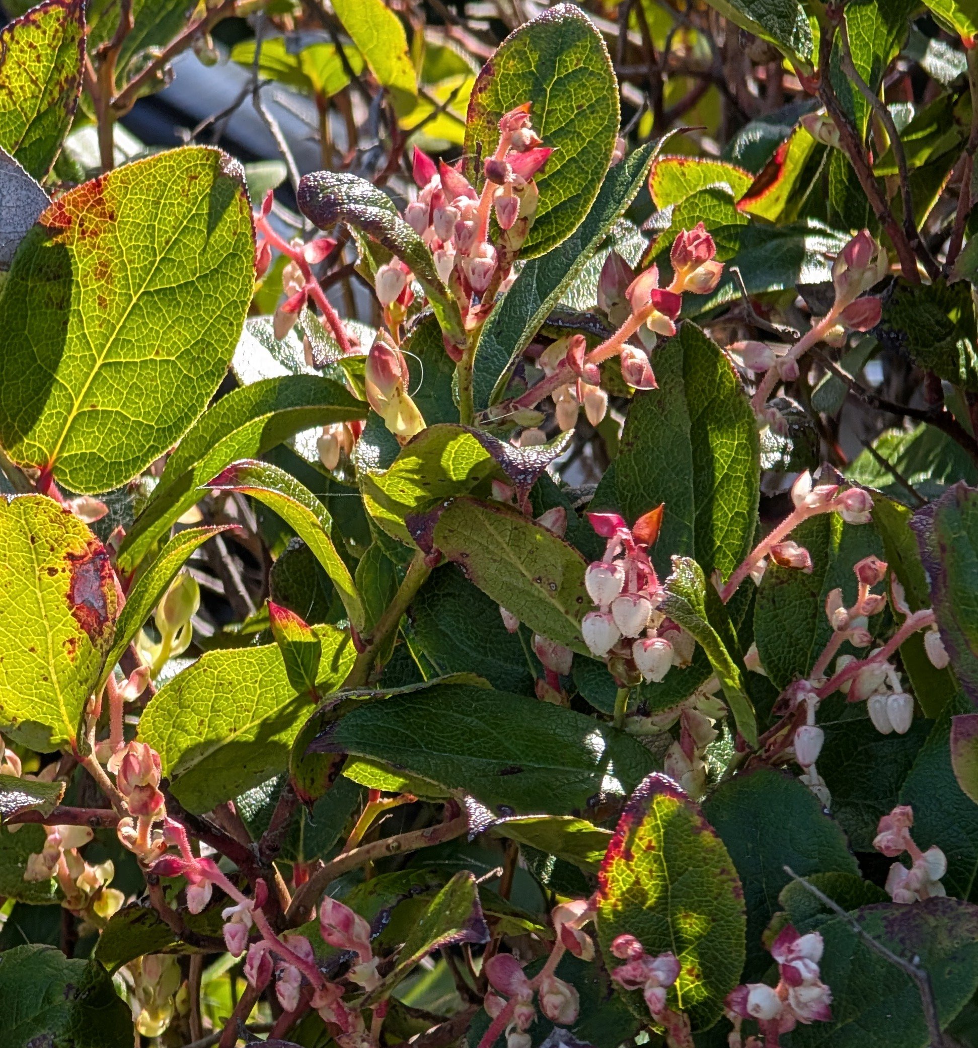 Salal is a gorgeous native evergreen shrub and a common understory plant in forests of the West Coast. It has dark green, rounded, thick leathery leaves that are prized in the florist trade. Pretty pink-white urn shaped flowers that appear in late Spring and continue through Summer. These cute flowers mature into edible tasty berries that can be eaten fresh or made into jams, jellies, and cakes etc. Flowering often continues even after the bush is heavy with ripe berries! Salal is easy to grow in the home garden, but it is slow and requires patience. Once established to its satisfaction Salal's growth rate will pickup substantially growing up to 6 feet tall in shade - part shade and often as wide or wider. It spreads out via rhizomes and makes a great ground cover. Salal prefers shade - part shade and moist to dry soil. It can tolerate full sun with occasional irrigation, though it may experience some sunburn periodically. In full sun Salal generally only grows to ~3 feet tall.